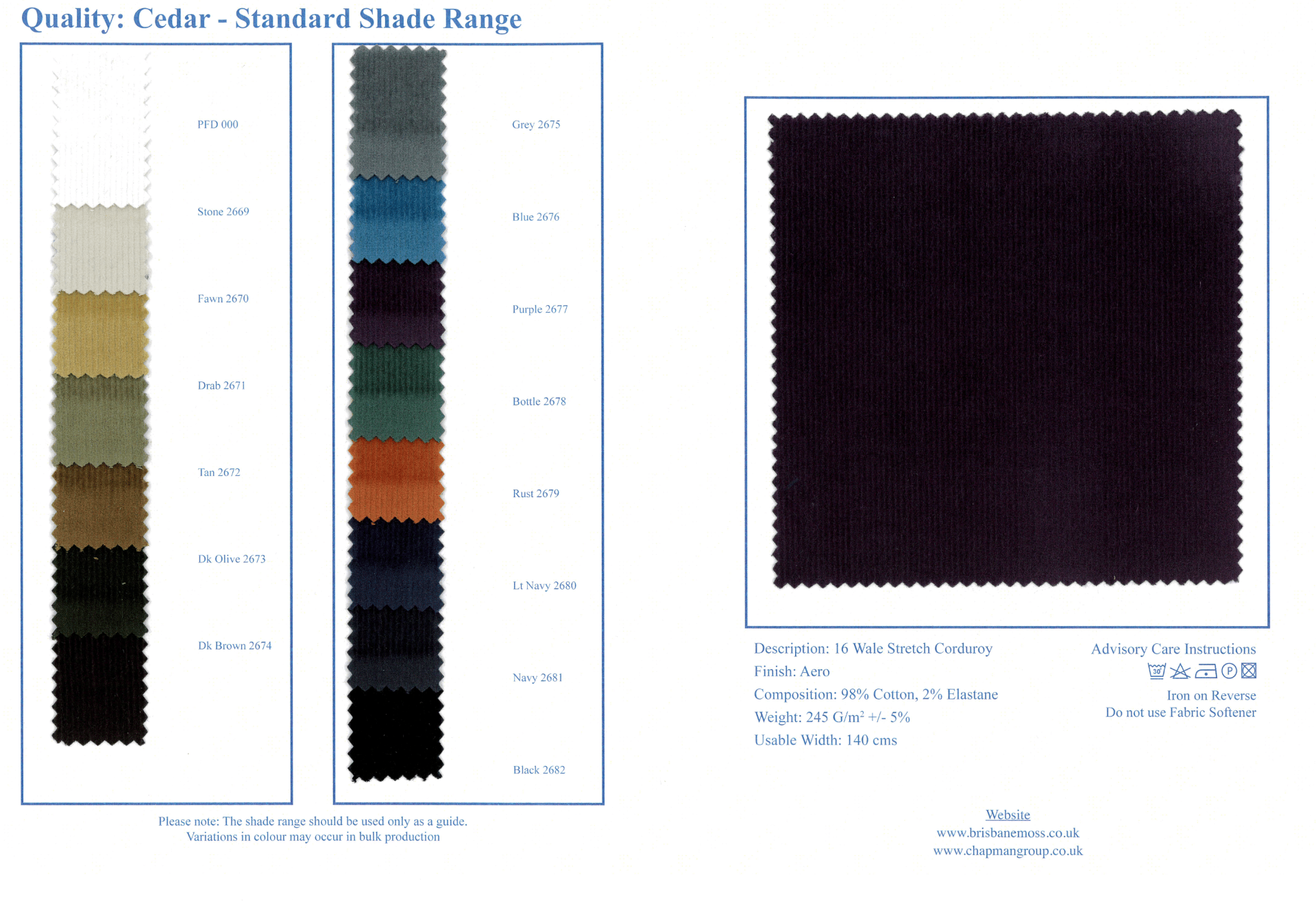 If you require a wider range of fabrics or guidance with your selection please email your enquiry to sales@brisbanemoss.co.uk or contact our sales team on +44(0)1706 815121. Shade cards or swatches are normally despatched within 48 hours. Shade cards or colour swatches sent to UK customers will be posted through Royal Mail. Shade cards and colour swatches despatched outside the UK will be via Courier however we can only despatch to EU customers on receipt of an EORI or VAT number.